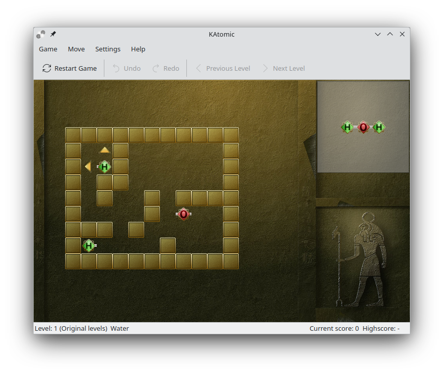 KAtomic ist sowohl ein unterhaltsames als auch lehrreiches KDE-Spiel über molekulare Strukturen. Es verwendet eine vereinfachte zweidimensionale Ansicht der zum Molekül gehörenden Elemente.