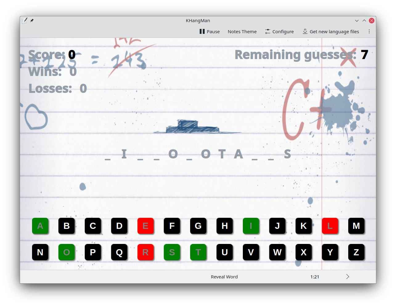 KHangMan basiert auf dem wohlbekannten Galgenmännchenspiel. Es ist ein KDE-Spiel für Kinder ab 6 Jahren mit verschiedenen Wort-Kategorien, zum Beispiel Tiere (Tiernamen) und drei unterschiedlichen Schwierigkeitsstufen: Leicht, Mittel und Schwer. Ein Wort wird zufällig ausgewählt, die Buchstaben verdeckt und Sie müssen das Wort raten, indem Sie einen Buchstaben nach dem anderen eingeben. Jedesmal, wenn Sie einen falschen Buchstaben eingeben, wird ein Teil des Galgenmännchens gezeichnet. Sie müssen das gesuchte Wort erraten, ehe das Galgenmännchen fertig gezeichnet ist! Dafür haben Sie 10 Versuche.
