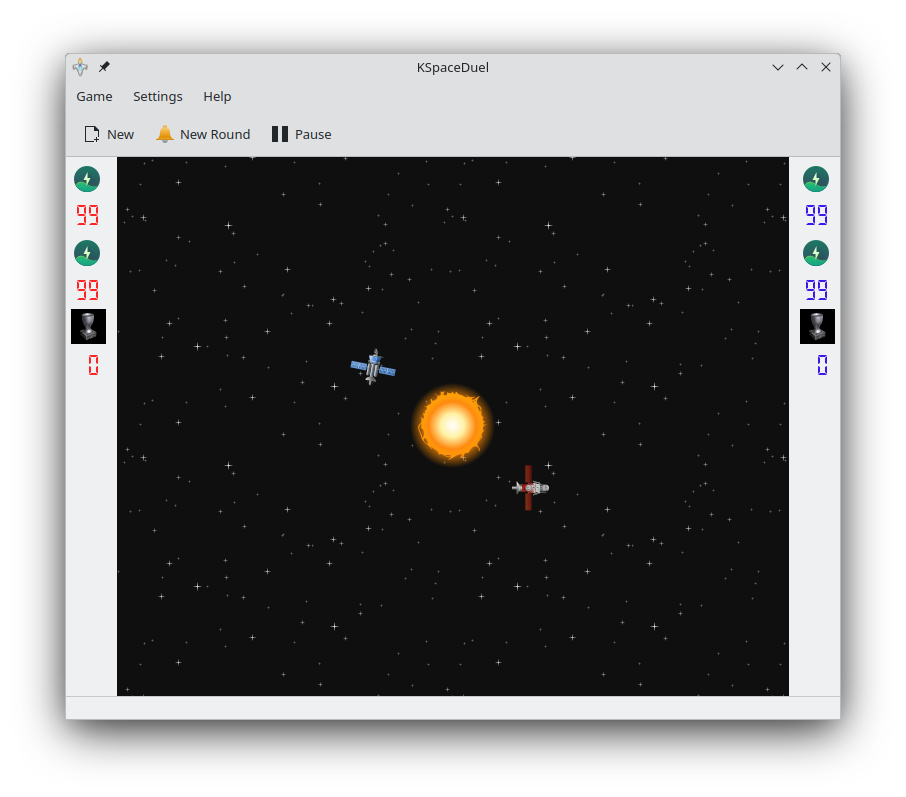 Ein KDE Gamespack-Spiel im Weltraum bei dem sich zwei einen Planeten umkreisende Satelliten gegenseitig abschießen müssen. Für Linux über den Paketmanager oder (nur) als Snap verfügbar.