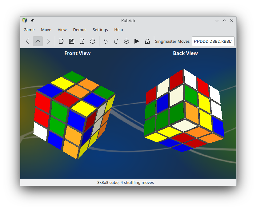 Kubrick basiert auf Rubiks Würfel. Es sind Würfel mit einer Kantenlänge von 2×2×2 bis 6×6×6, Quader (z. B. 5×3×2) oder Matten (z. B. 6×4×1 oder 2×2×1) wählbar. Das Spiel bietet eine Auswahl verschieden-verdrehter Würfel bei unterschiedlichen Schwierigkeitsgraden und Demos von schönen Würfel und Lösungsversuche. Es können auch eigene Würfel erstellt werden.