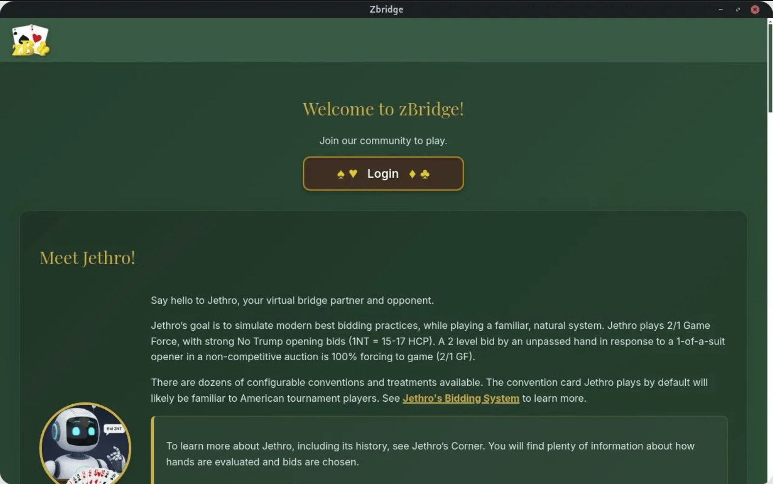 zBridge ist eine Bridge-Spielplattform bei dem man Bridge lernen und online gegen einen Computergegner (Jethro) oder andere Spieler spielen kann. Es gibt eine native App über Flatpak für Linux.